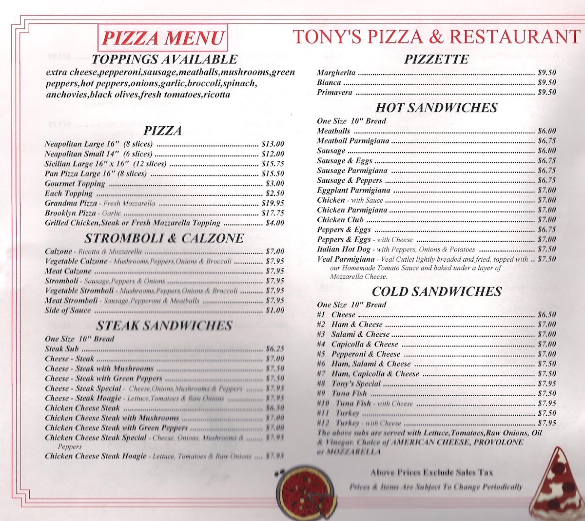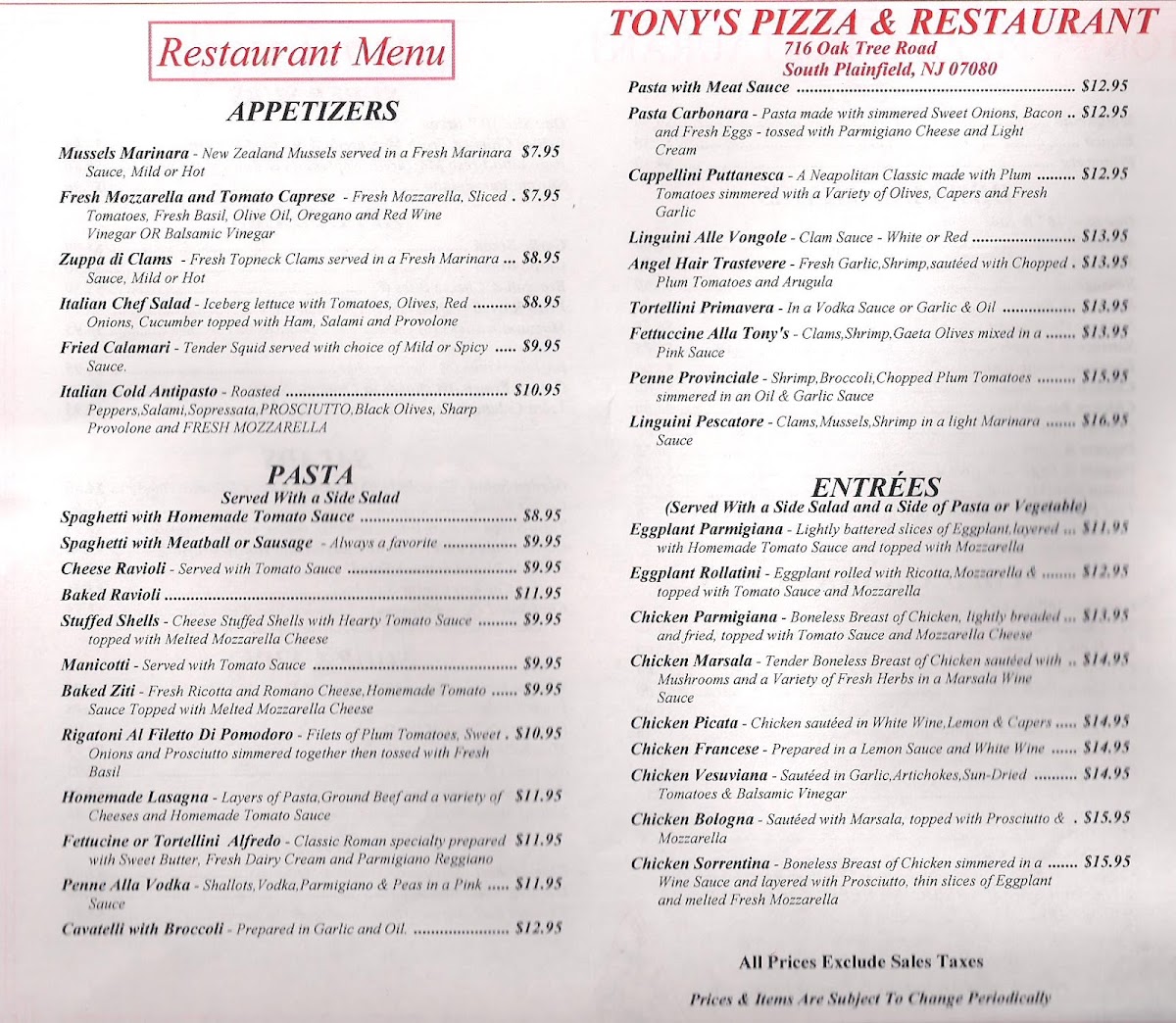 At Tony's Pizza & Restaurant Menu, you’ll find a blend of classic comfort foods and mouth-watering Italian favorites. Whether you’re craving a slice of perfectly baked pizza or looking for something more filling, Tony's offers a diverse menu that promises to satisfy. From fresh salads and savory pasta dishes to hearty subs and tempting appetizers, there’s something for every taste. The warm, family-friendly atmosphere makes it the perfect spot for a casual meal, and the menu reflects that same welcoming vibe. Each dish is crafted with quality ingredients, ensuring a delicious experience from start to finish. It’s the kind of place where you can indulge in your favorite comfort foods or try something new with every visit.